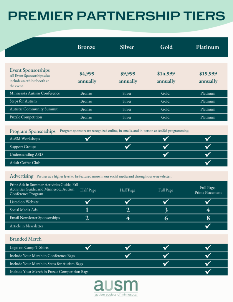 The Autism Society of Minnesota (AuSM) Premier Partnerships are sponsorship opportunities that are ideal for organizations interested in supporting and reaching Minnesota’s autism community throughout the year in many ways.